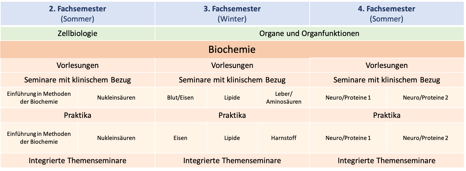 Ihr werden von uns durch das zweite, dritte und vierte Semester begleitet. Zu jedem Semester haben wir zahlreiche Lehrende, die euch im Rahmen der Vorlesungen einen spannenden Einblick in die Biochemie des menschlichen Körpers geben werden. Dieses Wissen werdet ihr im Rahmen der Seminare mit klinischem Bezug vertiefen. Hier werdet ihr auch auf die anschließenden Praktika vorbereitet. In Lehrlaboren werdet ihr zu den erlernten Inhalten auch praktische Anwendungsmethoden kennenlernen, indem ihr sie selbst, angeleitet durch unsere Assistenten, anwendet.